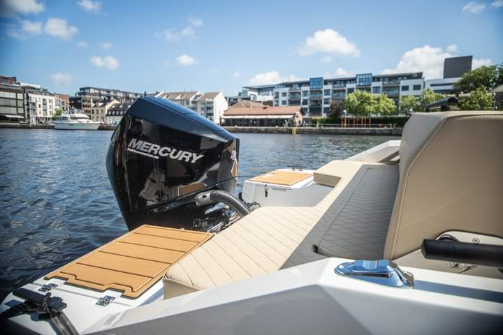 Consola central – Barandillas delanteras y traseras – Set de tapicería – Tanque combustible 190L. – Luces de navegación – Bomba de achique – Conexión 12V – Instalación eléctrica – Kit de ducha – Asientos tipo bucket reversibles – Extensión solarium asiento en U popa – Bimini – Trambucho de proa adaptación solárium – Extensión solarium proa – Acero en negro mate – Plataformas popa – Equipo sonido – Plataformas de popa integradas c/ escalera